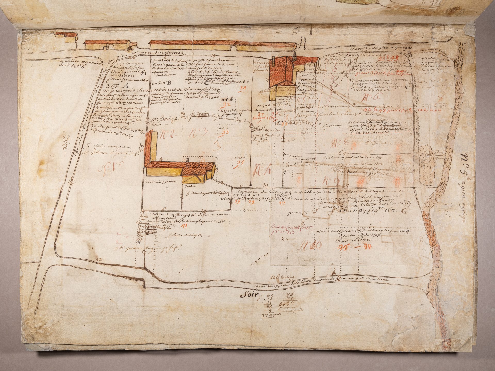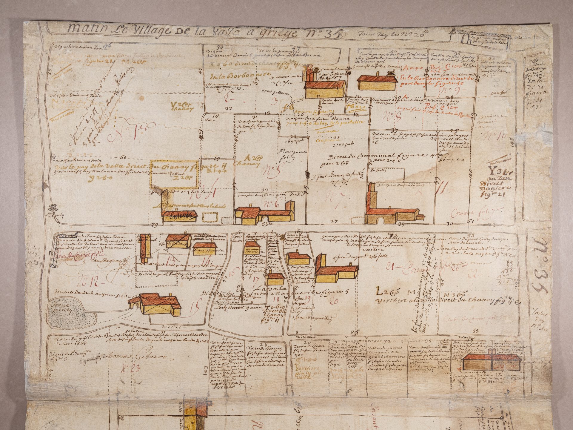 Sur l’atlas de Grièges, sont représentées les parcelles avec leurs occupants du moment, leur contenance en coupées ou en moaux de foin par exemple, leurs liens avec les diverses seigneuries locales : « en direct de » (Asnières, Château de Pont de Veyle, Coursant, Le Chanay, Montépin, etc…).