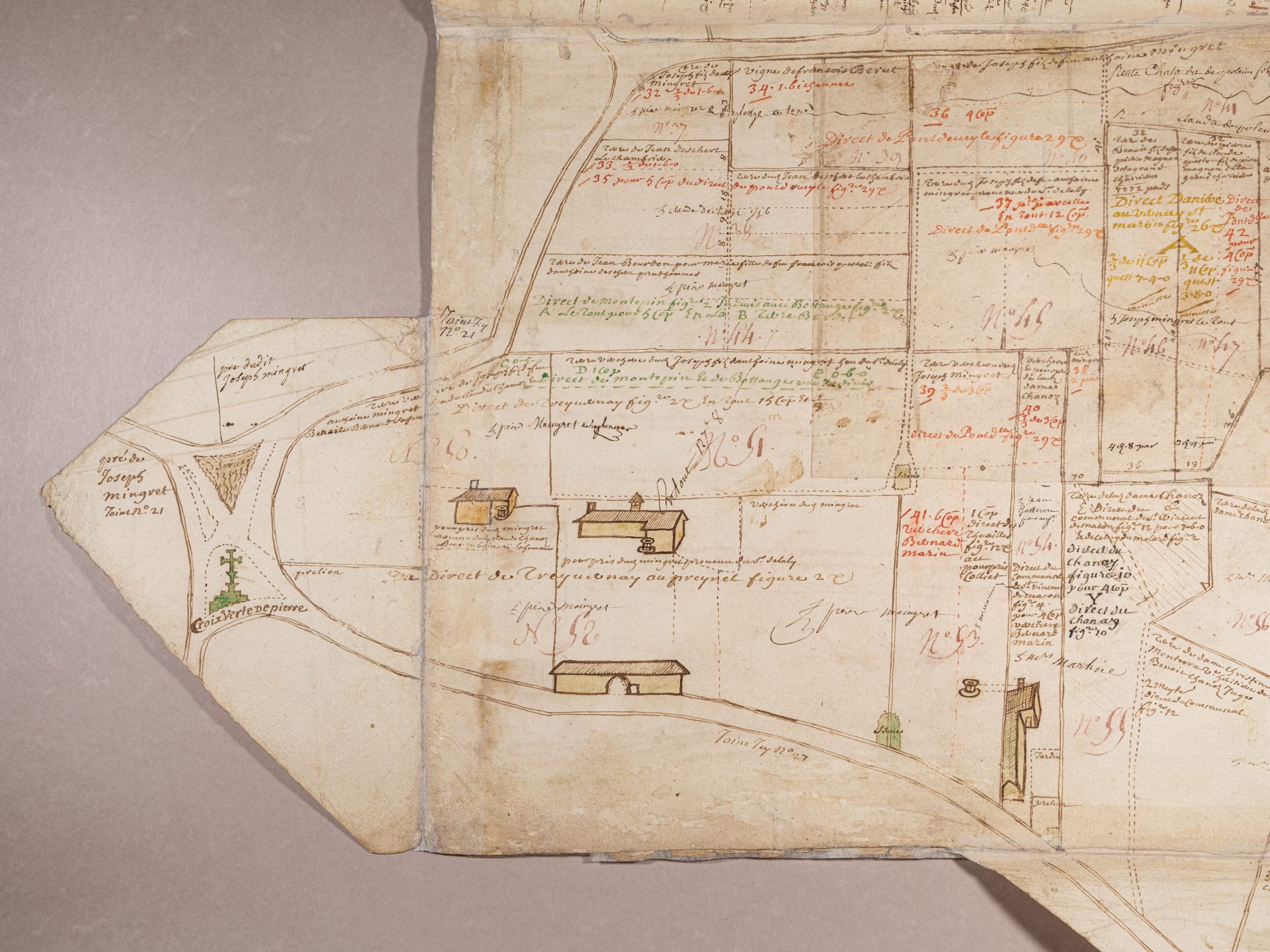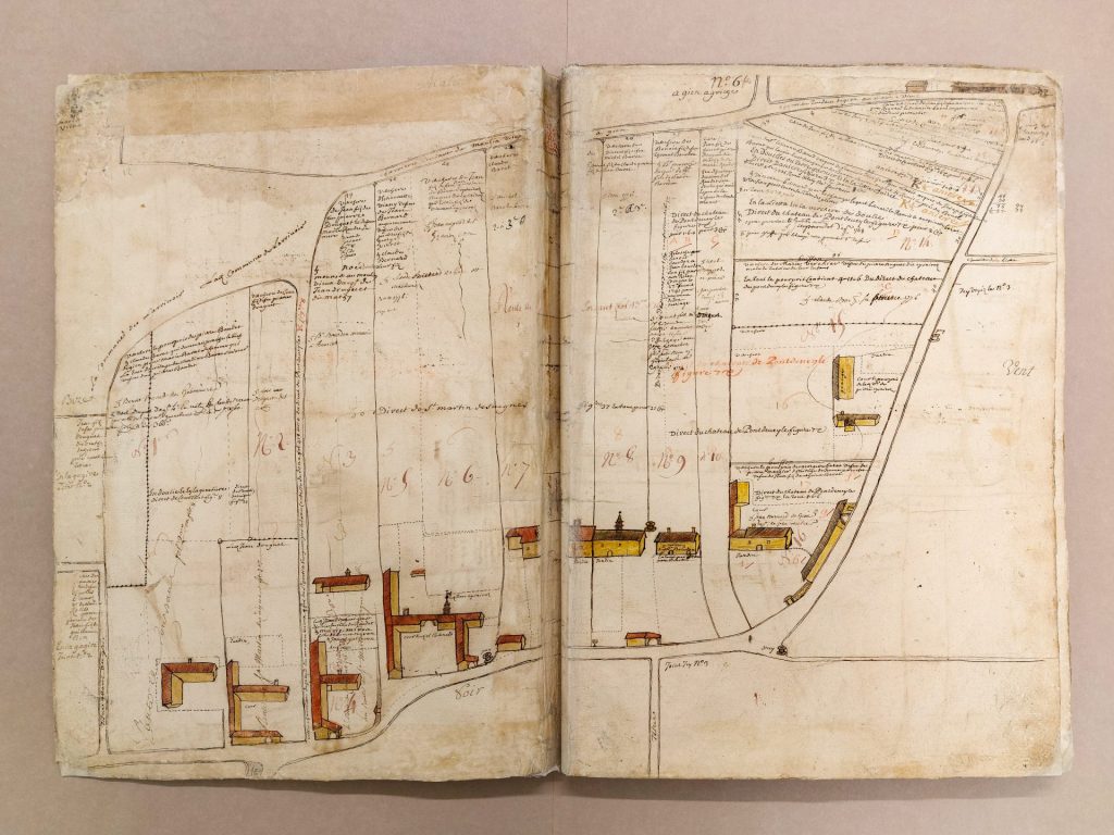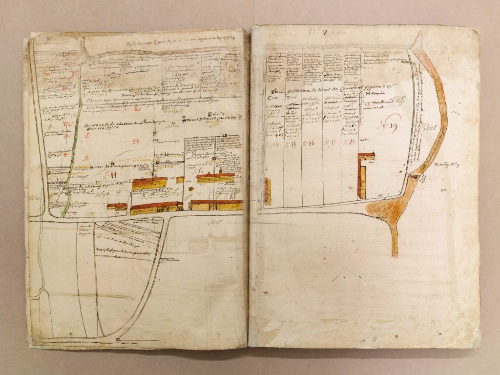 Les constructions y sont dessinées en deux dimensions avec souvent désignation de leur usage (maison, grange), de même que les nombreux puits et fours.