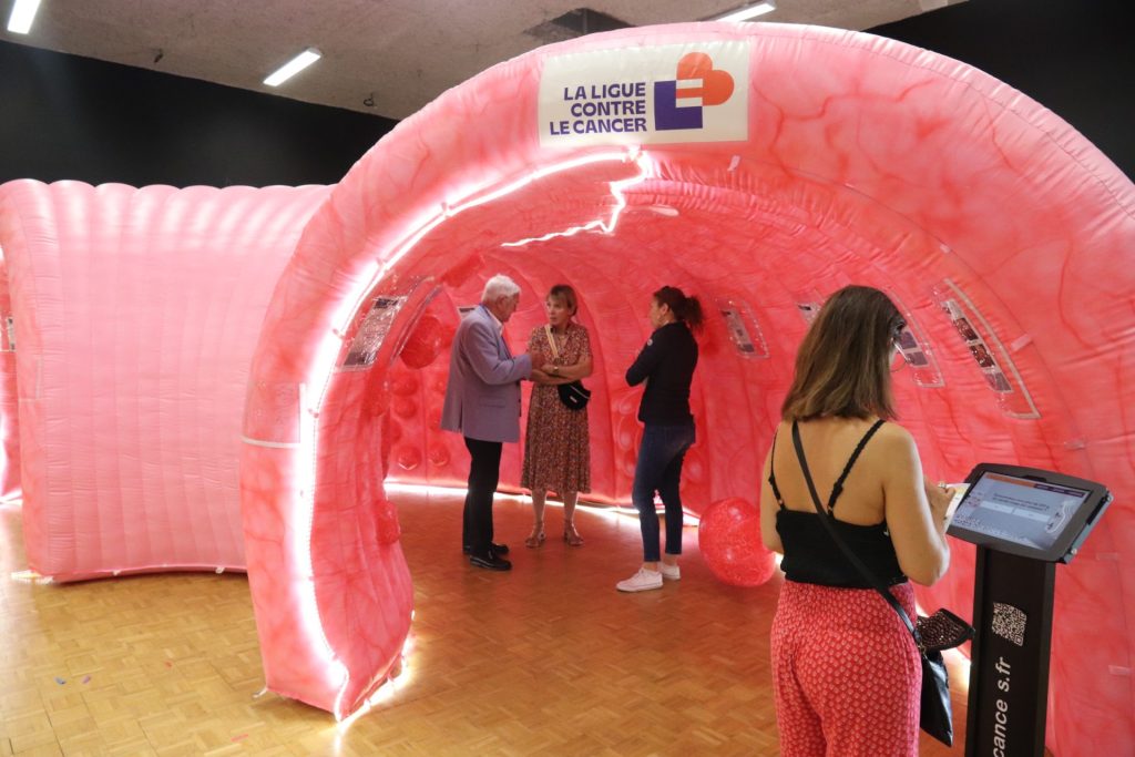 Nous nous mobilisons également afin de sensibiliser au dépistage. Ainsi, en association avec la délégation des bords de Veyle, nous étions présents à l’Escale lors du forum des associations avec le Colon Tour. Cette structure gonflable représentant l’intérieur d’un colon a été visitée avec intérêt, par les nombreuses personnes du territoire présentes sur le forum. Elles ont également apprécié les explications du Dr BRUHIERE, président de la Ligue départementale, qui commentait la visite et répondait aux questions des visiteurs.